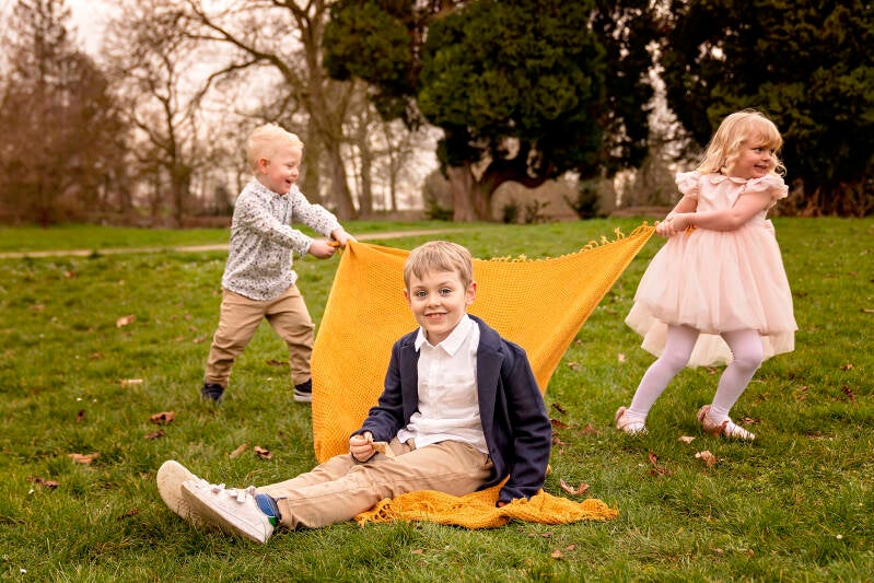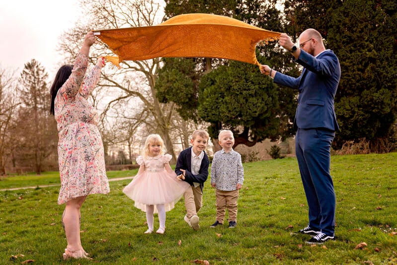 De beste foto's zijn die waarop iedereen ontspannen is en plezier heeft. Neem wat rekwisieten of speelgoed mee, vertel moppen, speel spelletjes. Als familiefotograaf moedig ik gezinnen altijd aan om tijdens de sessie met elkaar in contact te komen, omdat ik dan echte glimlachen en gelach kan vastleggen.